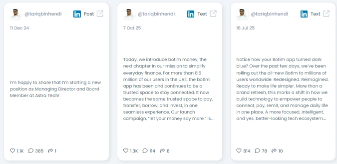 Tariq Bin Hendi, PhD, is the CEO of Astra Tech, the company behind Botim and other digital finance initiatives in the Middle East. He combines academic rigor with hands-on product leadership and a focus on financial inclusion. Under his stewardship, Botim has expanded payments, remittance, and wallet services for millions in the UAE. Tariq’s posts show both high-level strategy and concrete product updates, from app redesigns to the launch of Botim Money. He often highlights partnerships, regulatory progress, and the operational steps needed to scale fintech in the region. That mix of research, management, and product focus makes him a go-to voice on fintech and inclusion.