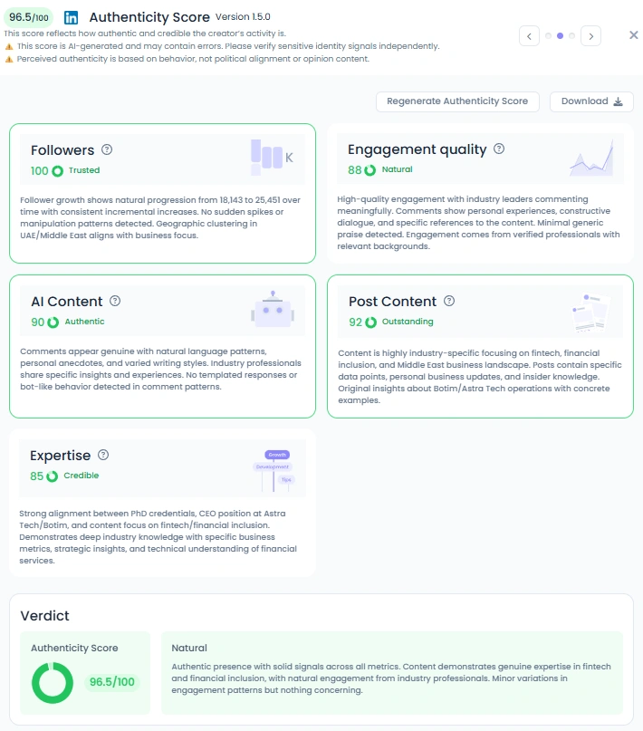 Tariq scores 96.5/100 on Favikon’s Authenticity metric. His content balances professional announcements with candid commentary about product choices and why they matter. Comments are substantive and come from industry peers, not generic praise. That pattern signals a real founder sharing real operational milestones, which builds trust across stakeholders.