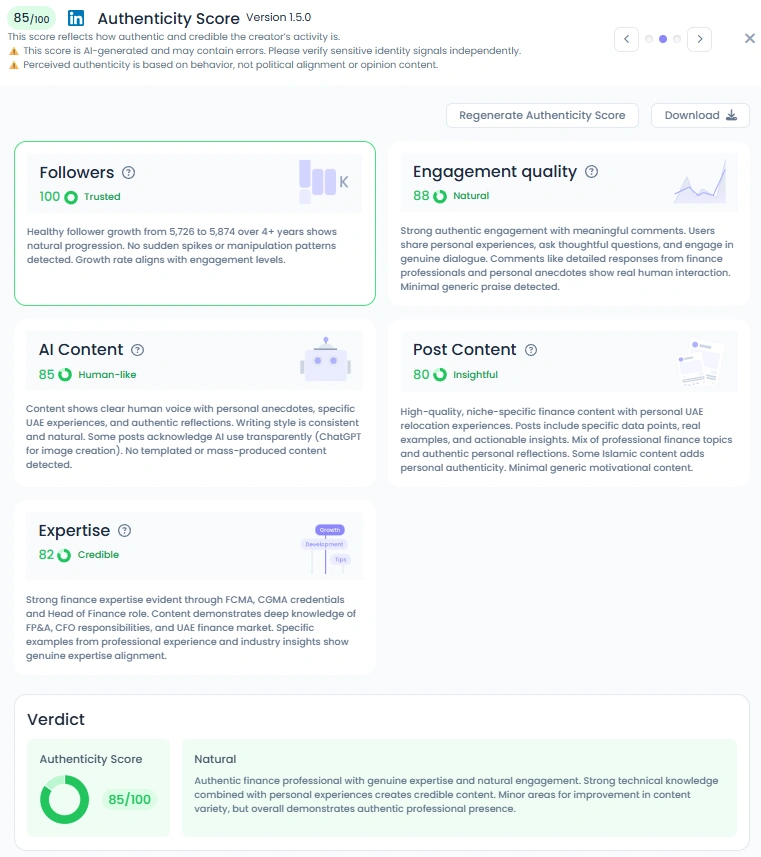 Favikon records an Authenticity Score of 85/100 for Tauseef, showing consistent, professional signals across his activity. His feed mixes candid photos, local observations, and finance commentary that reads like a colleague rather than a pundit. Engagement patterns show real dialogue, with people sharing their experiences and practical advice. That natural interaction builds credibility and trust.