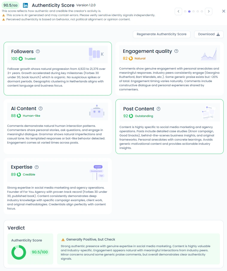 Her following grew from 4,923 to 21,376 in just over two years with steady momentum. Engagement quality scores 82 Natural, AI content signals 88 Human like, and post content 92 Outstanding. Expertise sits at 89 Credible, aligned with agency operations and published work. Influence Score is 8,225 pts, with TikTok videos regularly crossing 187K to 351K views and Instagram posts around 108K.