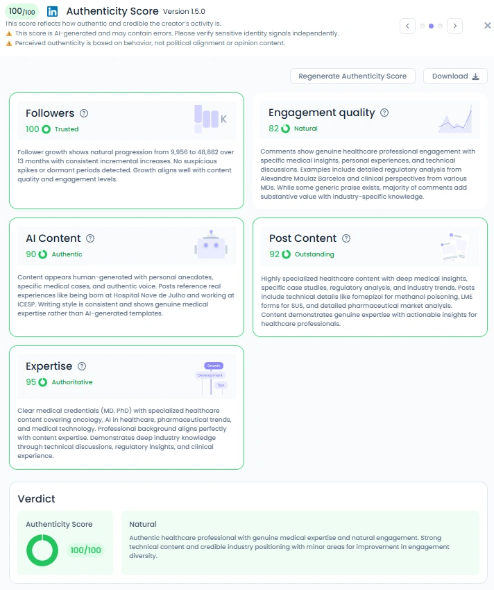 Favikon flags Thiago at 100/100 for authenticity. His feed mixes technical threads with candid moments, such as reflections during hospitalization or quick clinical tips. He posts original case insights rather than templated headlines. Comments show real medical dialogue and respectful debate. That balance of authority and openness is exactly why his voice feels trustworthy.