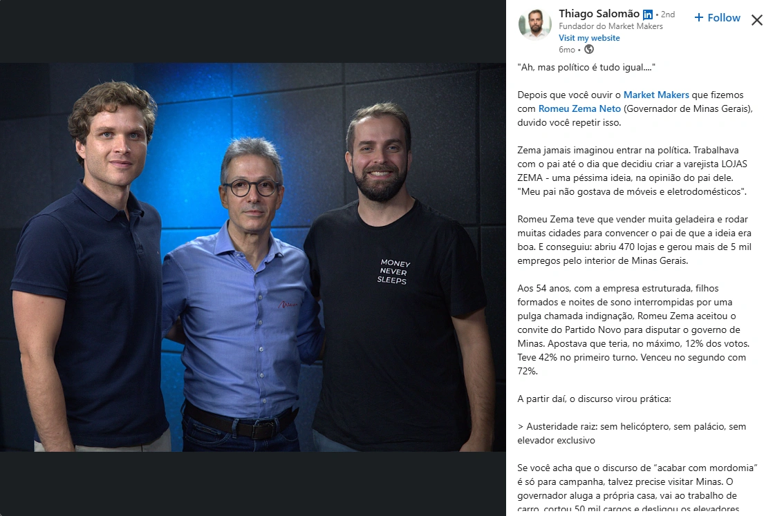 Through Market Makers, Thiago has collaborated with some of the biggest names in finance, from CEOs to investment managers and political figures. His episodes have featured Romeu Zema, Governor of Minas Gerais, and leading voices from institutions like BTG Pactual and Binance. His partnerships go beyond guest interviews and open up national conversations about economics, innovation, and policy. Every collaboration strengthens his brand’s mission to make finance more transparent and relatable for all.