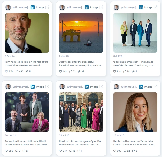 His network includes system operators, energy companies, policy makers and major equipment partners. Logos around his profile show ties to RWE, Siemens Energy, Uniper, national ministries and international energy bodies like the IEA. He also connects with regional governments and industry groups involved in transmission, storage and renewables. That ecosystem gives him both technical credibility and political reach.