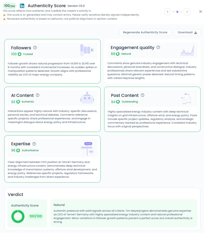 Favikon scores his authenticity at 100 out of 100, reflecting a natural, expert presence. His feed includes professional portraits, on-site imagery and team introductions. Comments are substantive and come from peers in grid engineering and energy policy. The overall impression is of a leader who communicates from direct experience.