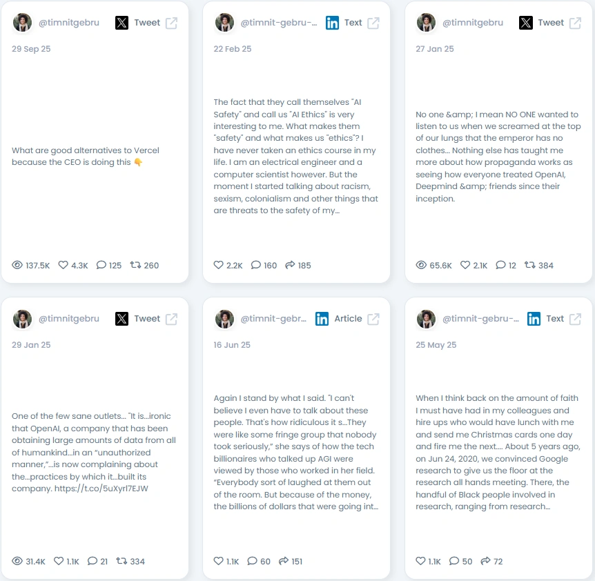 People listen to Timnit because she speaks with uncompromising moral clarity and deep technical expertise. Her communication style is Authoritative and often contrarian, challenging mainstream narratives about AI development. She uses strong language to critique tech billionaires and what she calls the "AGI scam". She shares evidence-backed positions and personal reflections, like her thoughts on the propaganda surrounding tech companies like OpenAI and Deepmind.