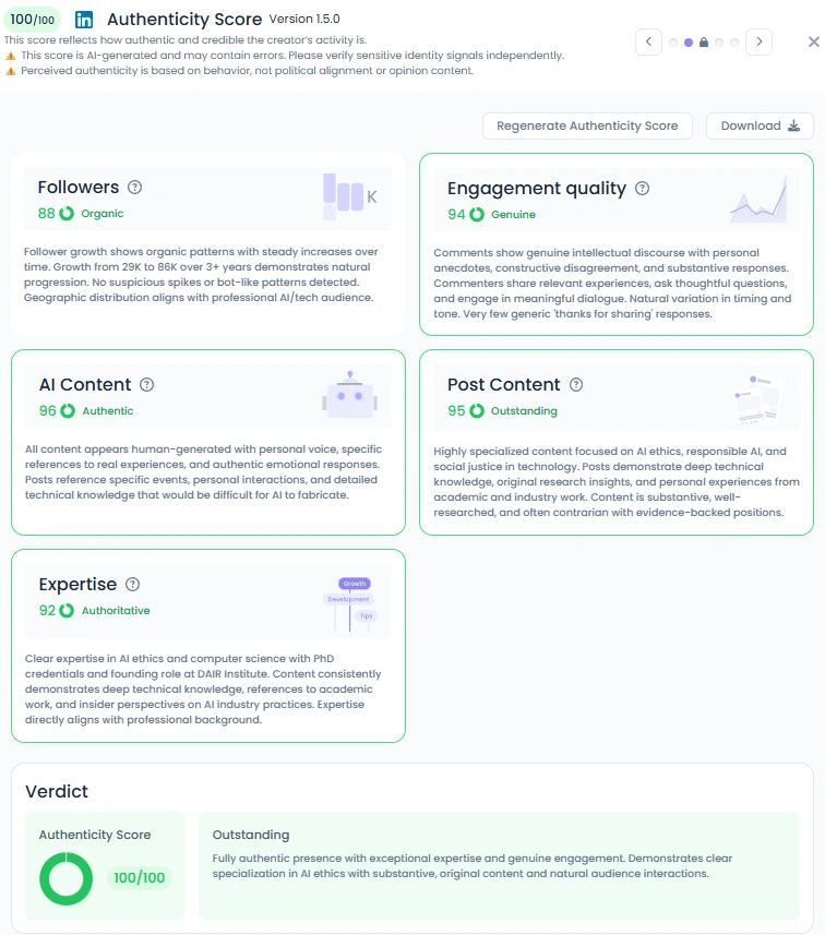 Timnit earns a perfect Authenticity Score of 100/100 with an "Outstanding" verdict. Her Followers score is 88 (Organic), showing steady, natural growth over three years. Her content is highly authentic, with an AI Content score of 96 (Authentic), using personal voice and technical references that are difficult for AI to replicate. Her engagement quality is Genuine (94), with comments showing intellectual discourse and sharing relevant experiences.