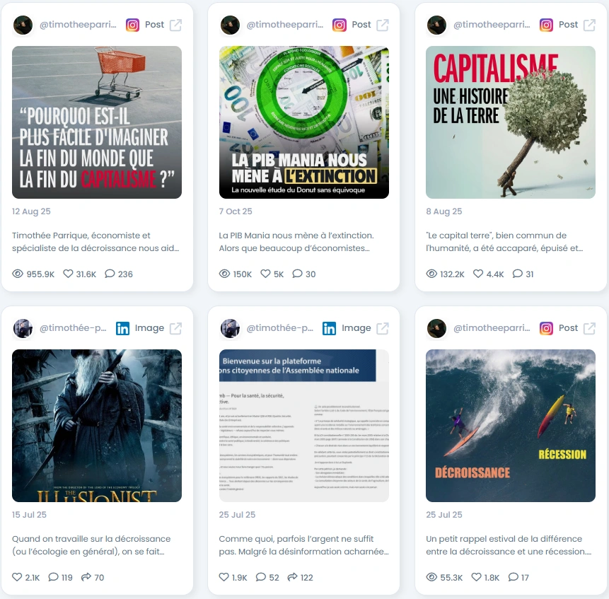 People listen to Timothée because he provides Outstanding (95/100) and highly specialized content in ecological economics. His posts include original research, academic citations, specific data points, and technical analysis. He translates complex concepts like degrowth into concrete examples, such as comparing the ease of imagining the end of the world versus the end of capitalism. His communication style is Educational and intellectually rigorous, demonstrating deep expertise backed by evidence.