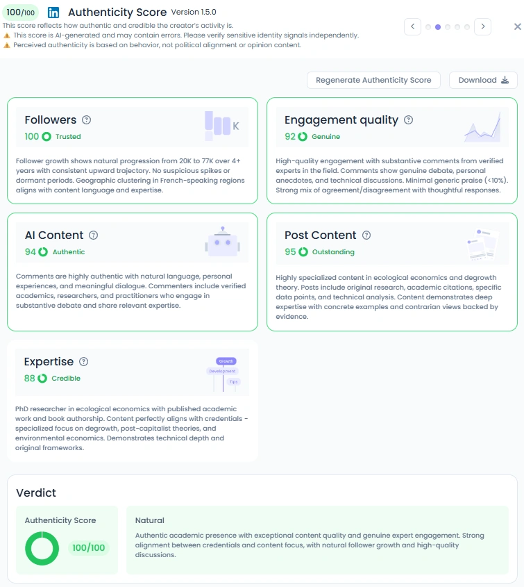 Timothée boasts a perfect Authenticity Score of 100/100, with a verdict of Natural. His follower growth shows a natural progression over four years, aligning with consistent upward trajectory. His content comments show genuine debate and personal experiences. He maintains a strong mix of agreement and disagreement with thoughtful responses. This authentic academic presence, combined with exceptional content quality and expertise, generates high-quality debate and deep trust.