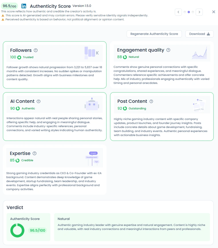 Tina scores 96.5 out of 100 on the Favikon Authenticity Index, and it shows in every post. Her interactions include heartfelt comments, shared stories, and honest reflections from industry peers. She posts milestone photos, team celebrations, screenshots from game builds, and even hand-drawn-style visuals that reflect her personality. Nothing feels curated for perfection. It feels real, warm, and driven by genuine connection with the community she cares about.