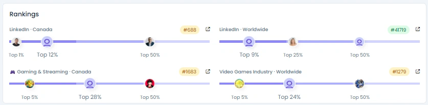 Tina’s follower count has grown steadily from 3,221 to over 5,800 in just 18 months. Her engagement rate stays strong with consistent comments from founders, producers, and players. She ranks in the top 12 percent of Canadian LinkedIn creators and within the top 24 percent worldwide in the video games category. Her Influence Score sits at 4,157 points, lifted by a strong posting rhythm tied to major releases and studio milestones.