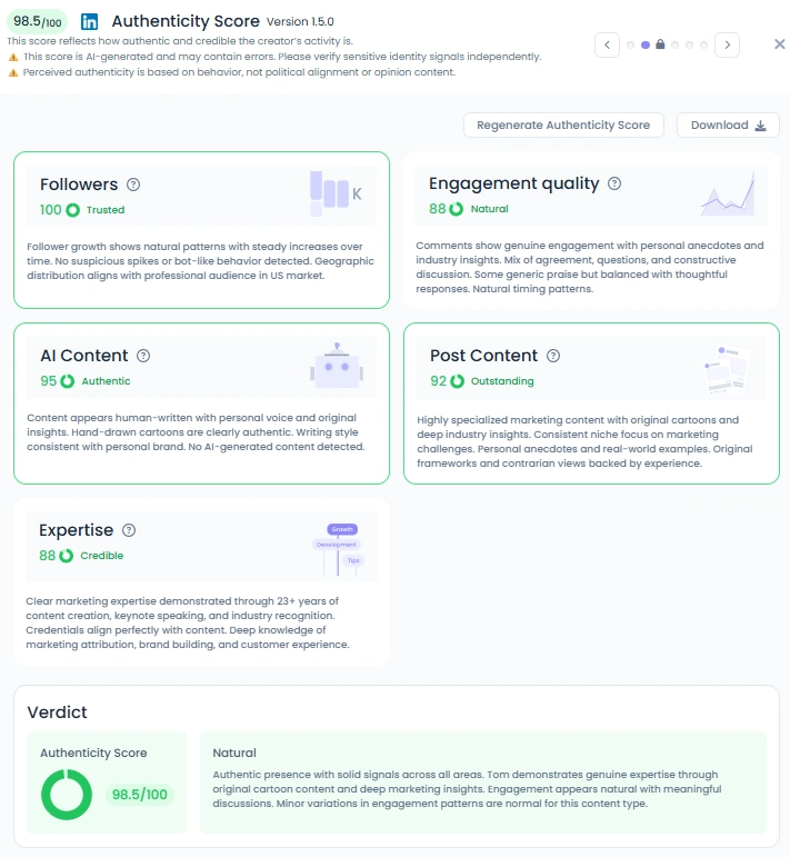 Tom’s Favikon Authenticity Score sits at 98.5/100, which shows his presence is seen as genuine and original. His posts are original drawings and personal reflections, not recycled slides or templated hot takes. The newsletter and on-the-ground examples from client work add context that proves the cartoons come from experience. That authenticity makes audiences trust his contrarian views.