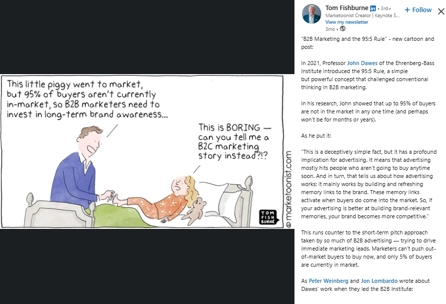 Tom speaks truth with a wink. His cartoons are plain to scan and sharp enough to share. People follow him because he simplifies without dumbing down. He surfaces common industry blind spots and makes them memorable. The result is content that gets saved, cited, and forwarded in Slack threads.