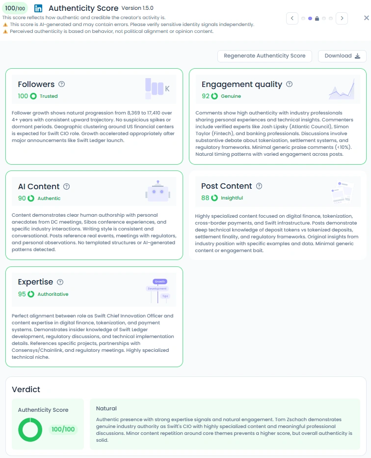 With an Favikon Authenticity Score of 100/100, Tom’s online presence is a masterclass in credibility. His Engagement Quality score of 92 shows that real professionals, from fintech executives to policy experts, engage with his ideas through meaningful discussions. His content feels genuine and consistent, grounded in years of firsthand experience. Tom’s conversational tone keeps even technical subjects approachable, showing that expertise and humility can coexist.