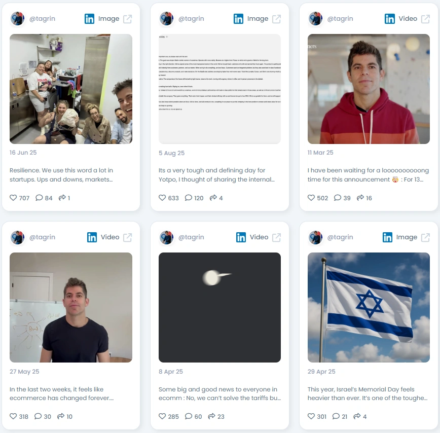 Tomer Tagrin brings a steady and human voice to the fast changing ecommerce world. He talks openly about leadership wins and losses, which makes his content stand out in a space filled with polished success stories. His posts mix business lessons, real emotions, and snapshots from life inside Yotpo. People follow him because he feels both relatable and confident.