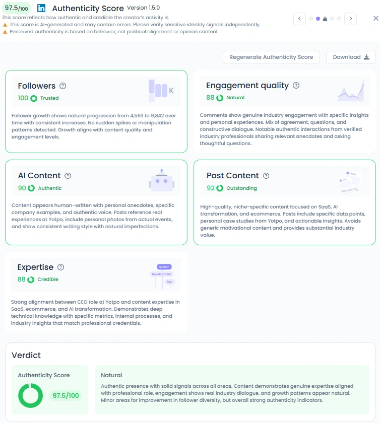 Tomer holds an impressive Favikon Authenticity Score of 97.5 out of 100. His posts include personal photos from Yotpo’s offices, screenshots from internal letters, and honest reflections about hard times. He writes with natural imperfections, which makes his voice feel real. Comments come from industry peers who share their own stories and ask thoughtful questions. Everything signals an authentic presence with no filter.