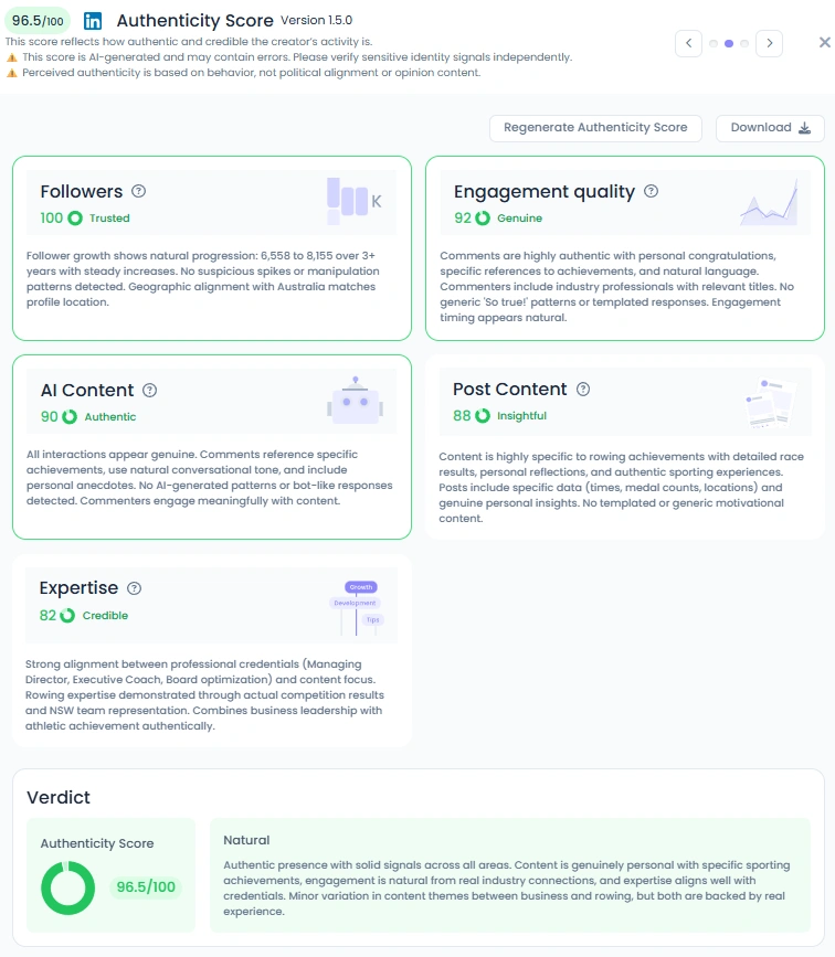 Her audience has grown steadily from about 6,500 to just over 8,000 followers across several years. Influence metrics place her well within the top tier for Australian LinkedIn creators in careers and corporate finance. Engagement quality is high, driven by meaningful comments and shares rather than short praise. Her posting rhythm is consistent around events, launches, and sporting milestones.