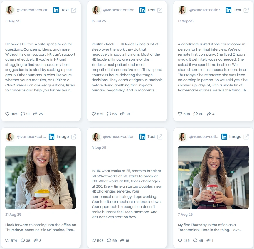 Her posts stand out because they’re real. Vanesa doesn’t use buzzwords or corporate fluff. Instead, she shares stories, dilemmas, and lessons learned from real-world experience. Whether she’s talking about hybrid work or the emotional side of leadership, her tone is grounded and human. Readers feel like they’re getting a note from a colleague, not a lecture. That mix of relatability and depth is what keeps her audience coming back.