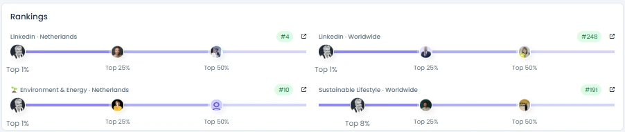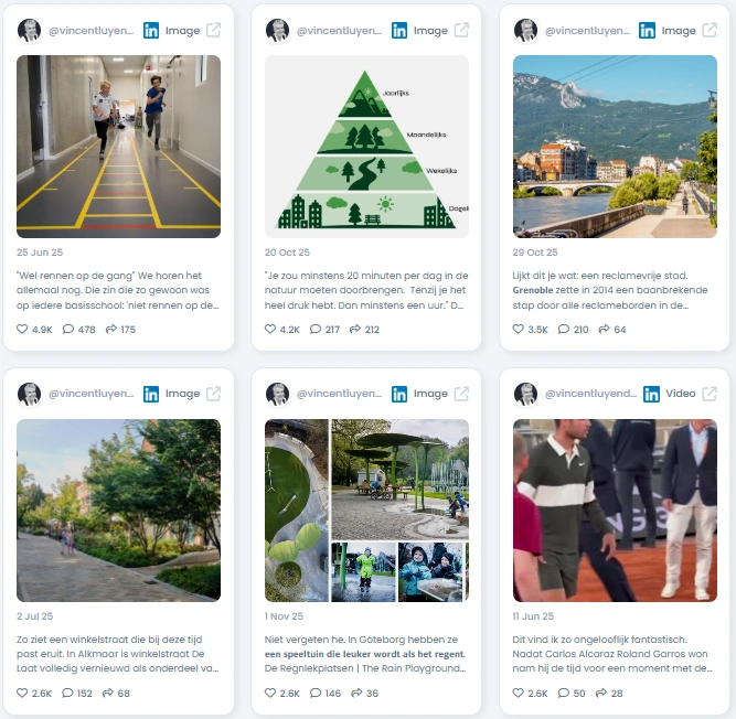 Vincent’s audience grew from about 25,800 to 31,400 followers in six months, showing steady organic interest. His Influence Score sits near 7,581 points, and he ranks in the top 1 percent on LinkedIn in the Netherlands. Engagement quality scores are high, with around 88/100 for meaningful interactions and 94/100 for post content. In short, reach and resonance track together he gets attention and thoughtful responses.
