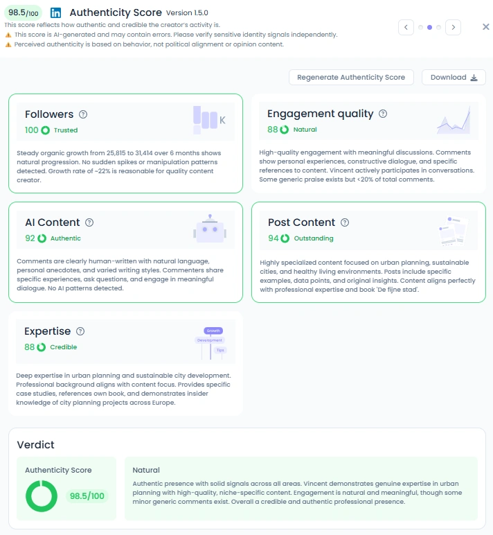 Favikon rates Vincent at 98.5/100 Authenticity, and the score fits what you see. His content reads human and specific: street photos, project snapshots, book excerpts, and local case studies. Comments and replies show real back-and-forth with planners, residents, and journalists. He rarely posts polished marketing fluff. Instead he shares lessons, fumbles, and wins, which builds both trust and approachability.