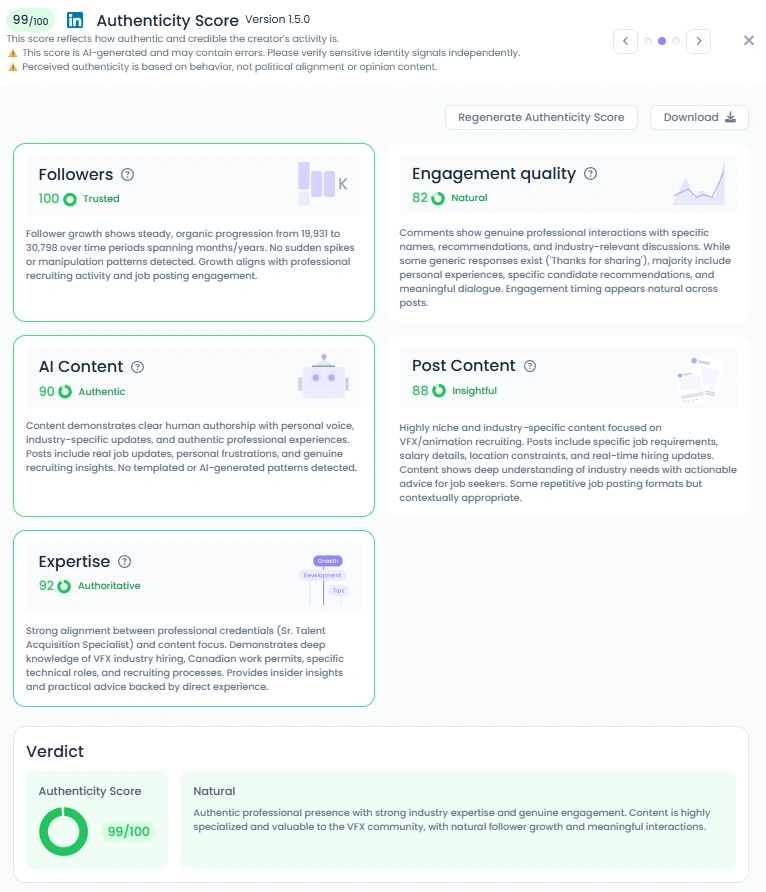 Favikon gives Viviana a 99 out of 100 Authenticity Score. Her content reads like real human authorship with personal voice, clear opinions, and direct interaction. She shares photos, hiring updates, and honest reflections about the market. The result is high trust and strong, meaningful engagement from her community.