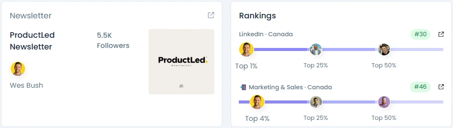 Wes has grown his following to nearly 40K followers with steady organic growth over three years. His influence score sits at 6,946 points, and his engagement quality is ranked as natural and consistent, with professionals actively joining the conversation. His newsletter, ProductLed Newsletter, has 5.5K+ subscribers, further cementing his reach. Ranked in the Top 1% on LinkedIn in Canada and Top 4% in Marketing & Sales, he’s among the most credible voices in SaaS growth.