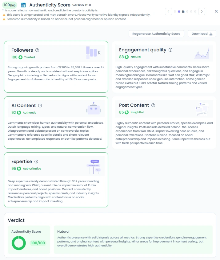 Willemijn scores a perfect 100/100 Authenticity Score, and it shows. Her feed balances professional milestones with personal reflections, from revisiting War Child memories to standing in solidarity with humanitarian causes. Her tone is warm, human, and at times deeply emotional. Comments on her posts aren’t empty compliments they’re thoughtful exchanges that spark genuine dialogue. Whether it’s Dutch wordplay, behind-the-scenes photos, or stories from conflict zones, her content feels deeply personal and refreshingly unfiltered.