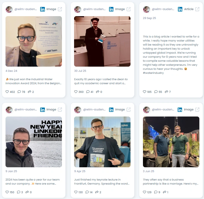 Favikon ranks Wim 100/100 for authenticity. His feed is full of original photos, event recaps, and direct commentary about projects and lessons learned. Engagement comes from industry peers who add technical details and follow up questions. That pattern shows real work, not marketing spin.