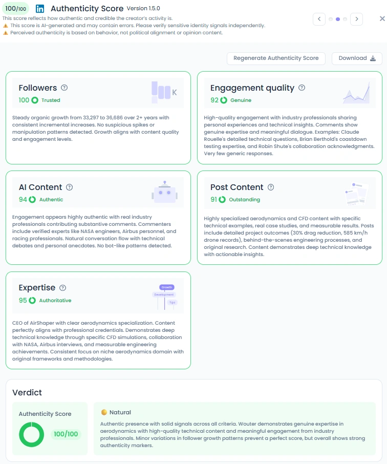 With an Favikon Authenticity Score of 100/100, Wouter’s credibility is unquestionable. His posts feature original simulations, field tests, and results that can only come from hands-on expertise. Comments on his content often include verified experts debating methodologies or adding insights, showing how deeply the professional community engages with him. No buzzwords or filler, just real data and transparent storytelling. His natural style and passion keep his audience hooked on the science behind performance.