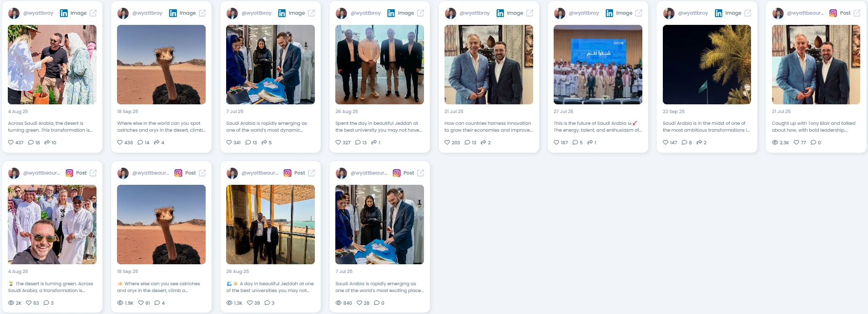 Wyatt spotlights partnerships across NEOM programs, KAUST research, and Vision 2030 initiatives. He hosts delegations, visits universities, and convenes investors around sustainability, desert greening, and frontier tech. Photos and recaps show real exchange, not staged handshakes.