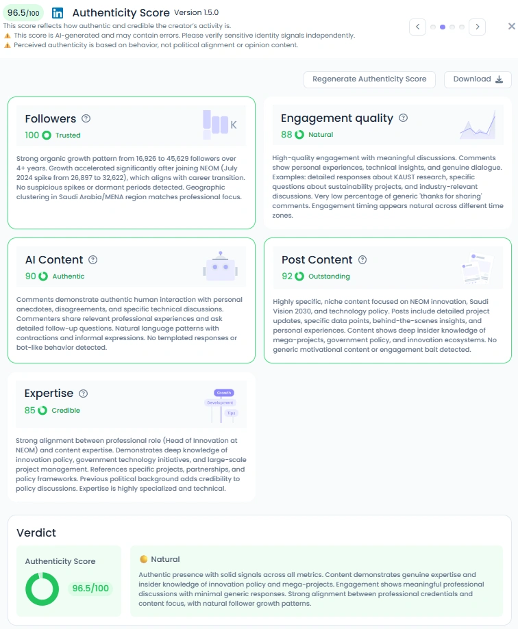 Favikon pegs his authenticity at 96.5/100. Comments include genuine debates, technical follow-ups, and personal anecdotes. No templated replies. No empty hype. You see behind-the-scenes moments from labs and classrooms, plus snapshots with students and policymakers. Authority meets approachability.