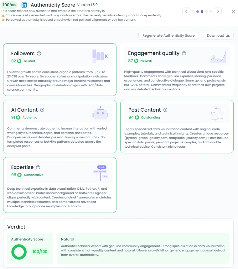 Yan’s Favikon Authenticity Score clocks a perfect 100/100. Comments read like real lab notes, not hype. He shares personal project examples, unique resources, and incremental progress on tutorials. No templated replies, no engagement bait. Just steady craft and honest learning.