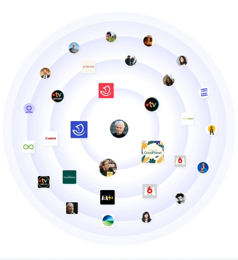 His network spans conservation NGOs, major broadcasters, and global brands. Logos and partners around his profile include GoodPlanet, Canon, national TV channels, and major media outlets. That mix shows influence across culture, media, and civil society. He is a trusted collaborator for institutions that need both artistry and credibility.