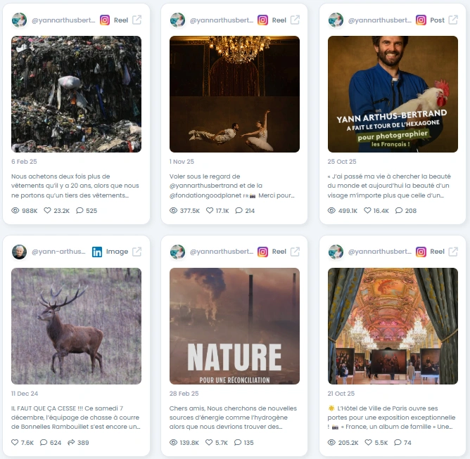 Favikon scores Yann at 100/100 for authenticity. His content reads as deeply personal and field tested. Posts include behind the scenes from documentary shoots, conservation updates, and strong visual essays. Comments show meaningful conversation, not hollow praise. For an artist-activist, his presence is both genuine and authoritative.
