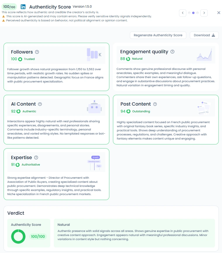 Yannick’s profile scores a perfect 100 out of 100 on Favikon’s LinkedIn Authenticity Score, and it’s easy to see why. His growth is entirely organic, rising from 1,150 to over 3,500 followers with no sign of inflated numbers or bot activity. His posts are full of personal reflections, professional debates, and real insights that spark meaningful dialogue. He regularly engages in comment sections, offering thoughtful replies and encouraging discussion. His content is rich in original thought, whether he's sharing feedback from a policy white paper or giving real-life examples of procurement challenges. With an AI content authenticity score of 92 and post content quality score of 94, Yannick proves that you can be technical and still keep it human.