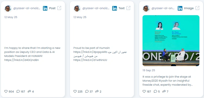 People engage with Yaser because he explains complex AI topics in a grounded, clear way. His tone is confident but friendly, and his posts highlight real applications of AI rather than speculation. He communicates the importance of responsible AI, cultural context, and research quality. His audience appreciates that he simplifies without oversimplifying.