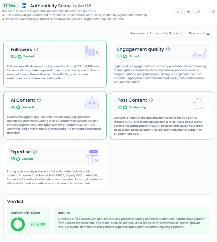 Yaser holds a 97.5 Authenticity Score, backed by natural conversation patterns and real engagement from industry experts. His posts feature conference moments, fireside chats, and career milestones that feel genuine and personal. Comments come from respected AI practitioners who bring thoughtful discussion. Nothing feels automated or templated which strengthens the trust around his expertise.