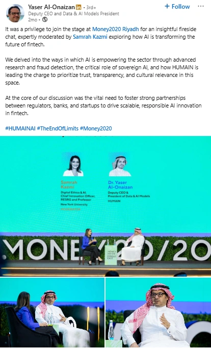 Yaser collaborates with global AI researchers, national regulatory bodies, and regional fintech and tech summits. His participation in EMLNP, Money2020 Riyadh, and HUMAIN leadership work positions him at the intersection of innovation and governance. His partnerships help shift conversations about AI from purely technical to strategic and cultural. He brings academic insight into real world deployment.