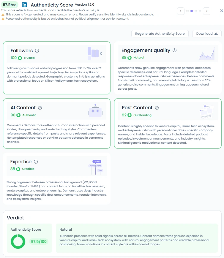 Yasmin earns a strong Authenticity Score of 97.5/100, and it shows. Her posts feel real, whether she’s sharing a podcast clip, celebrating an 80th birthday, or reacting to current events. There are no templated messages or vague “thought leadership” phrases. Her community responds with long comments, disagreements, and personal stories. She creates an environment where people feel comfortable showing up as themselves.