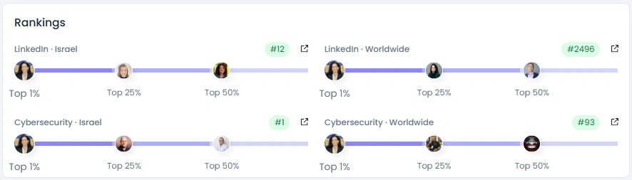 Yasmin’s audience has grown from 33K to 78K followers over the last two years with steady, organic progression. Engagement remains strong across varied content, from reels to written posts. Her Influence Score sits at 7,992 points, placing her in the Top 1 percent on LinkedIn in Israel and Top 1 percent in Cybersecurity nationally. Her content quality score is exceptional, especially in the venture capital and Israeli tech categories.
