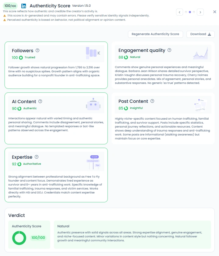 Yolanda’s authenticity is undeniable and her Favikon Authenticity Score of 100/100 proves it. Her posts reflect genuine emotion, thoughtful commentary, and real conversations with other survivors and advocates. She engages with her followers in meaningful dialogue, often replying personally and sharing her own experiences. Nothing feels templated or staged. Whether it’s a heartfelt reflection or a celebratory post about another survivor’s success, Yolanda’s online presence feels raw, warm, and real.