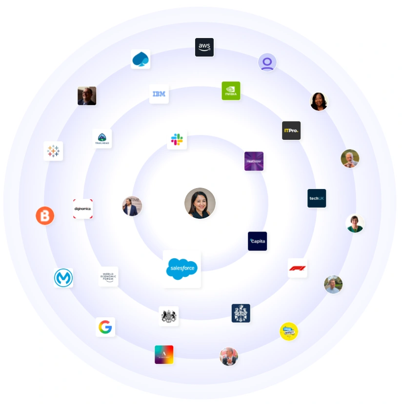 Her orbit includes global platforms and UK institutions. Think AWS, Google, NVIDIA, IBM, Slack, Tableau, MuleSoft, Heathrow, Capita, and techUK. Add policy and civic reach through UK government departments and the World Economic Forum. The mix signals board-level credibility and access across enterprise, public sector, and the broader tech ecosystem.