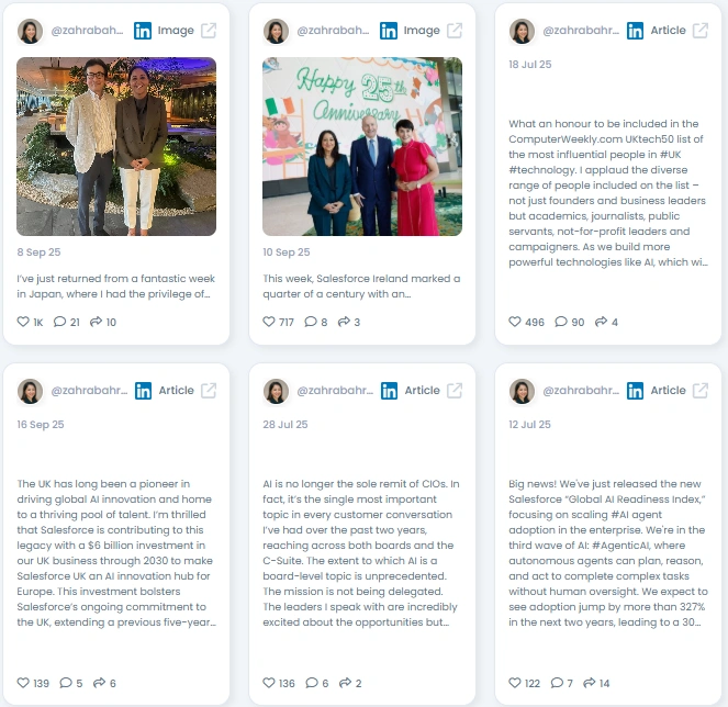 Zahra leads with clarity and lift. She talks about AI adoption like a CEO who ships, not a commentator who watches. Her updates blend UK tech policy, enterprise reality, and people-first leadership. Smart, warm, and grounded.