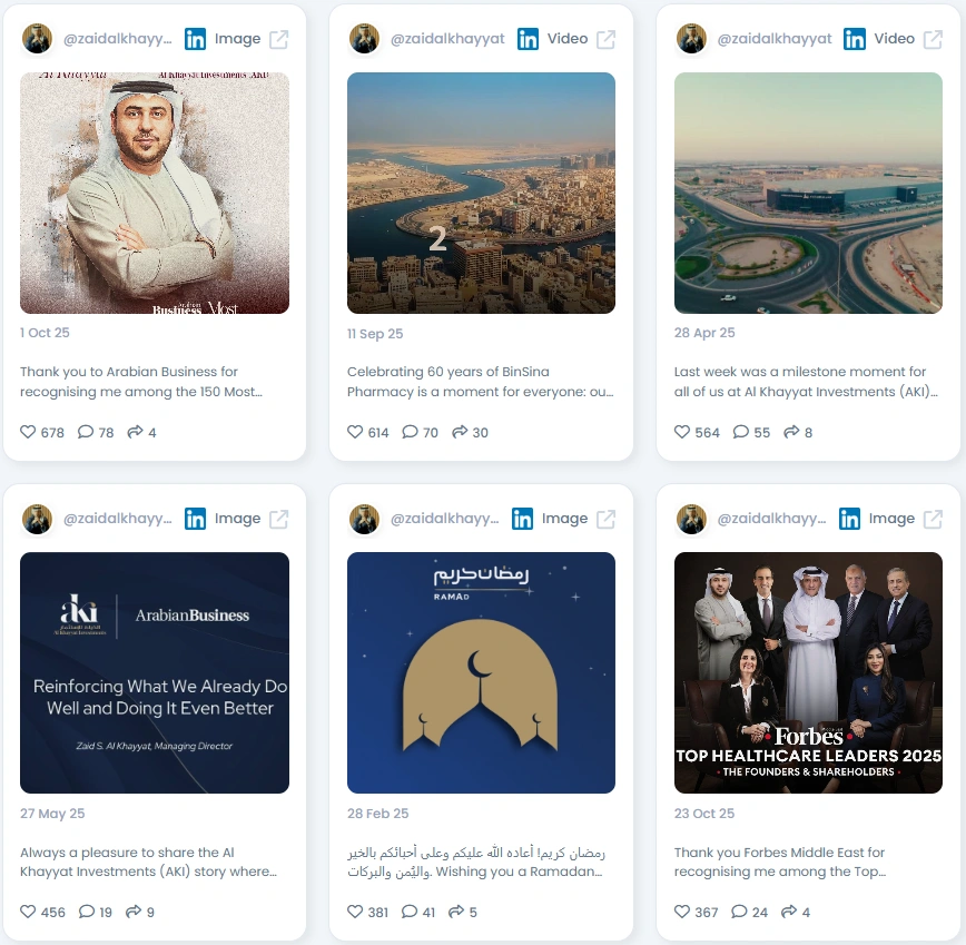 Zaid S. Al Khayyat is one of the most respected business voices in the UAE, known for leading with both tradition and forward-thinking vision. As Managing Director of Al Khayyat Investments, he guides one of the country’s most prominent family businesses while fostering innovation, sustainability, and growth. His online presence reflects a leader who values community, celebrates his team’s achievements, and inspires others through genuine storytelling and purposeful leadership.