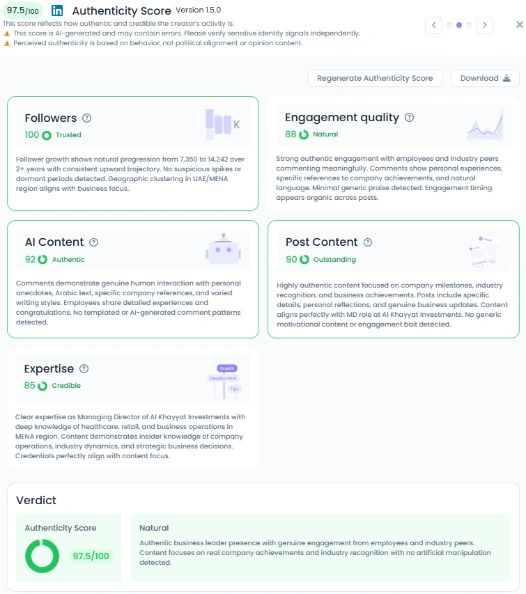 With an Favikon Authenticity Score of 97.5/100, Zaid’s content stands out for its sincerity and human connection. His posts often include Arabic and English, showing cultural depth and inclusivity. He engages naturally with employees and peers, with comment sections full of genuine conversations rather than formal praise. His transparency, gratitude, and consistency make his leadership both credible and approachable.