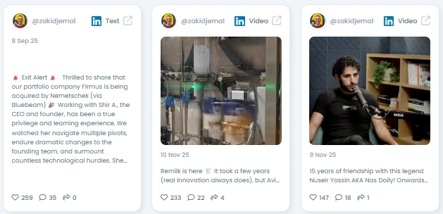 His Authenticity Score of 97.5 reflects a highly credible presence. Zaki posts candid founder stories, acquisition updates, and on the ground photos from investor breakfasts. Comments come from real founders and investors who have worked with him. His voice balances professional insight with personal warmth, which keeps interactions natural and meaningful.