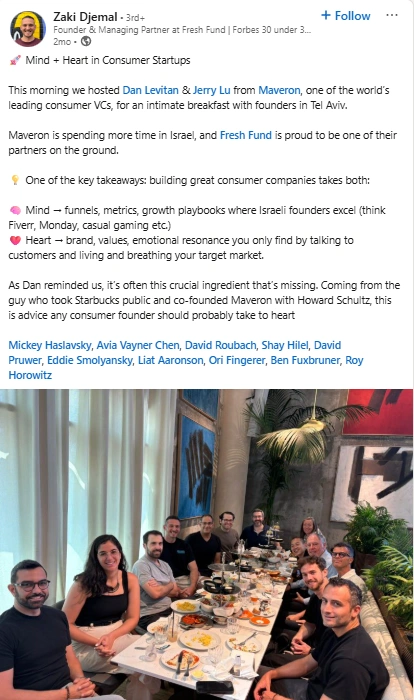 Zaki works closely with venture partners, portfolio founders, and strategic industry partners. He hosts founder breakfasts, partners with global VCs visiting Israel, and supports startups through early scaling stages. His collaborations help founders access capital, talent, and practical growth playbooks.