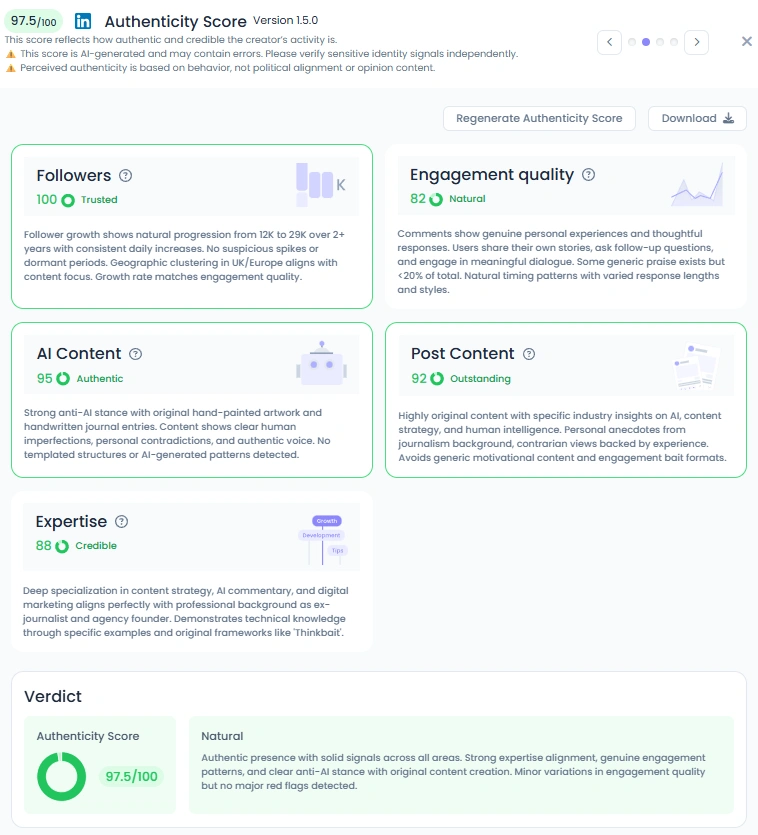Favikon rates her authenticity 97.5/100. Threads feature handwritten notes, original artwork, and lived moments. She challenges trends without scolding and invites counterpoints. The voice is warm, firm, and consistently human.