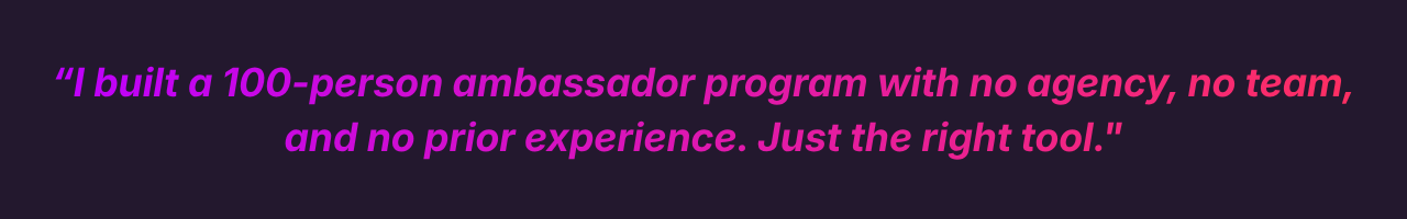 • Scaled from 0 to 100+ ambassadors in 6 months with a single person and no agency
