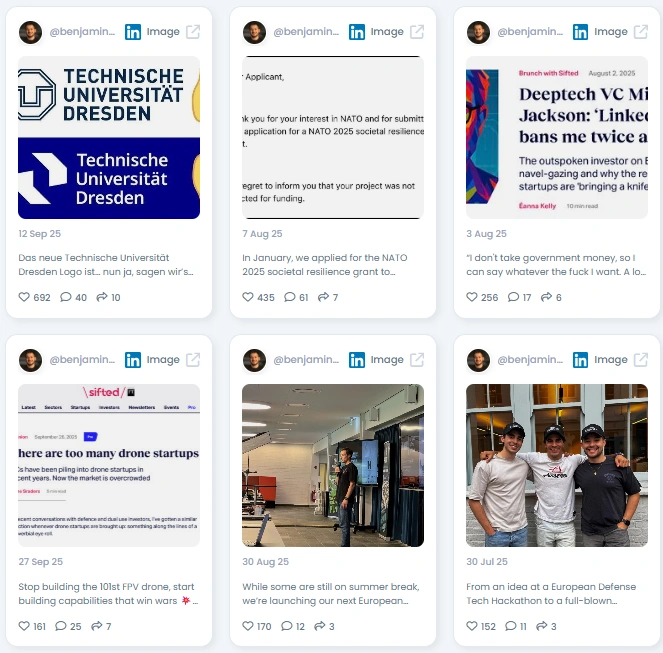 Sein Umfeld umfasst Gründer, Betreiber und politische Entscheidungsträger europäischer Deep-Tech-Beschleuniger, Sicherheitsforen und Forschungseinrichtungen. Sie werden Universitäten, Risikofonds und Konferenzplattformen sowie Innovatoren im Verteidigungsbereich und Community-Hubs sehen. Diese Mischung verleiht seinen Threads eine ungewöhnliche Reichweite, von Labortischen bis hin zu Entscheidungsräumen.