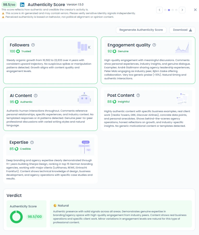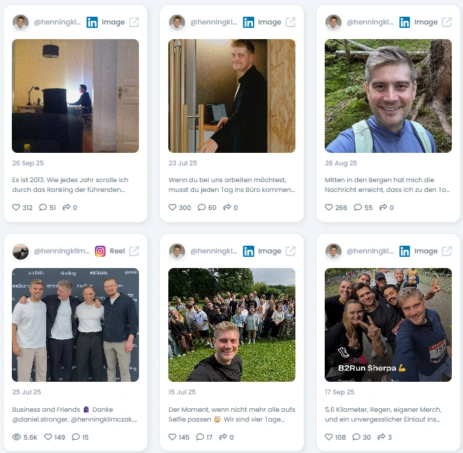 Hennings Favikon Authenticity Score liegt bei 98,5/100. Kommentar-Threads lesen sich wie echte Fachgespräche von Kunden und Kollegen. Die menschlichen Signale sind hoch (95 authentisch) und die Interaktionsqualität ist 92 echt. Du siehst Trailfotos, Schnappschüsse aus dem Büro und ehrliche Teamsiege. Es fühlt sich offen, bodenständig und stolz auf die Menschen an, die die Arbeit machen.